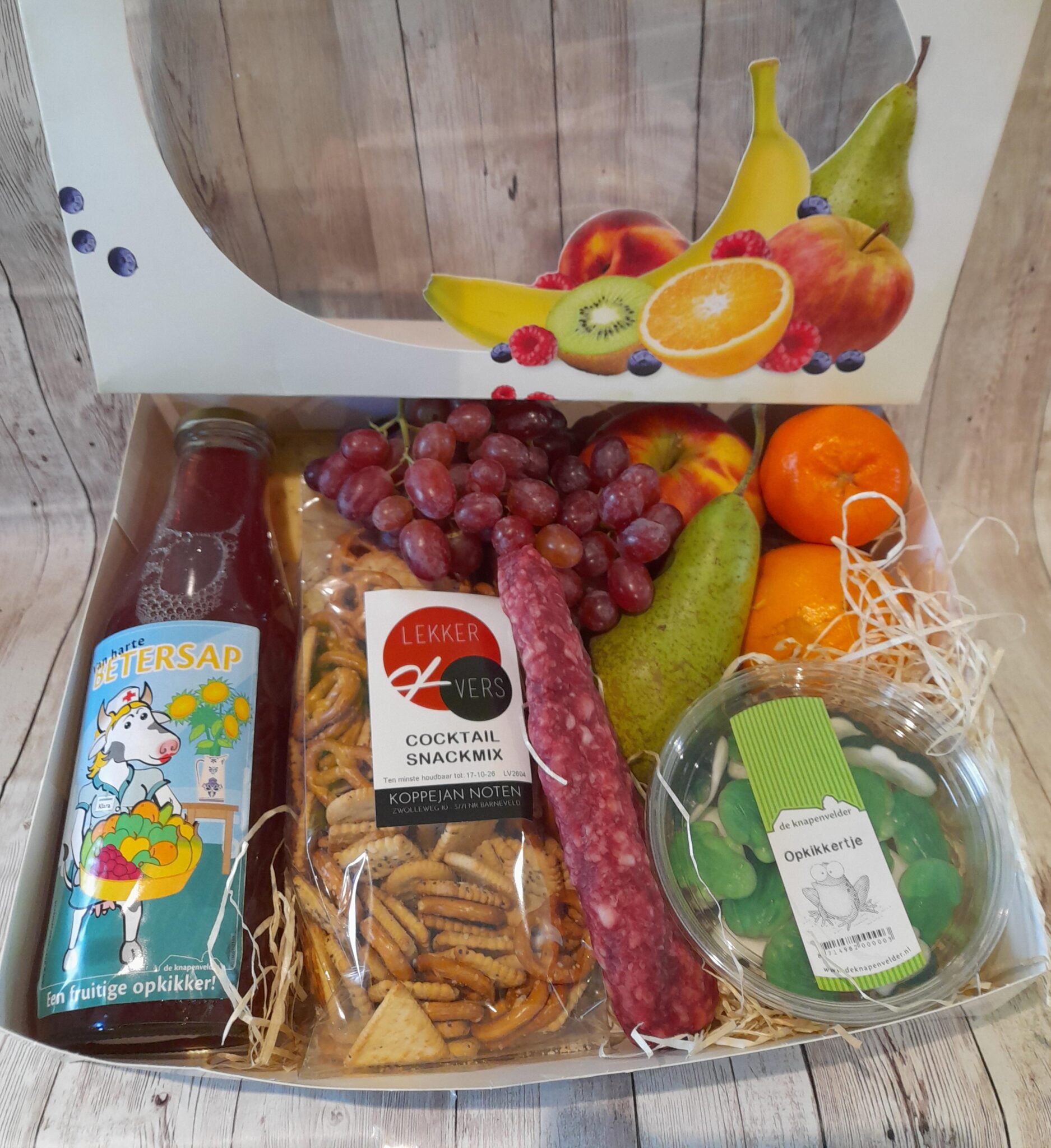 - diverse soorten stuks fruit bijv appel, peer, druiven, mandarijnen (naar wat het seizoen te bieden heeft)